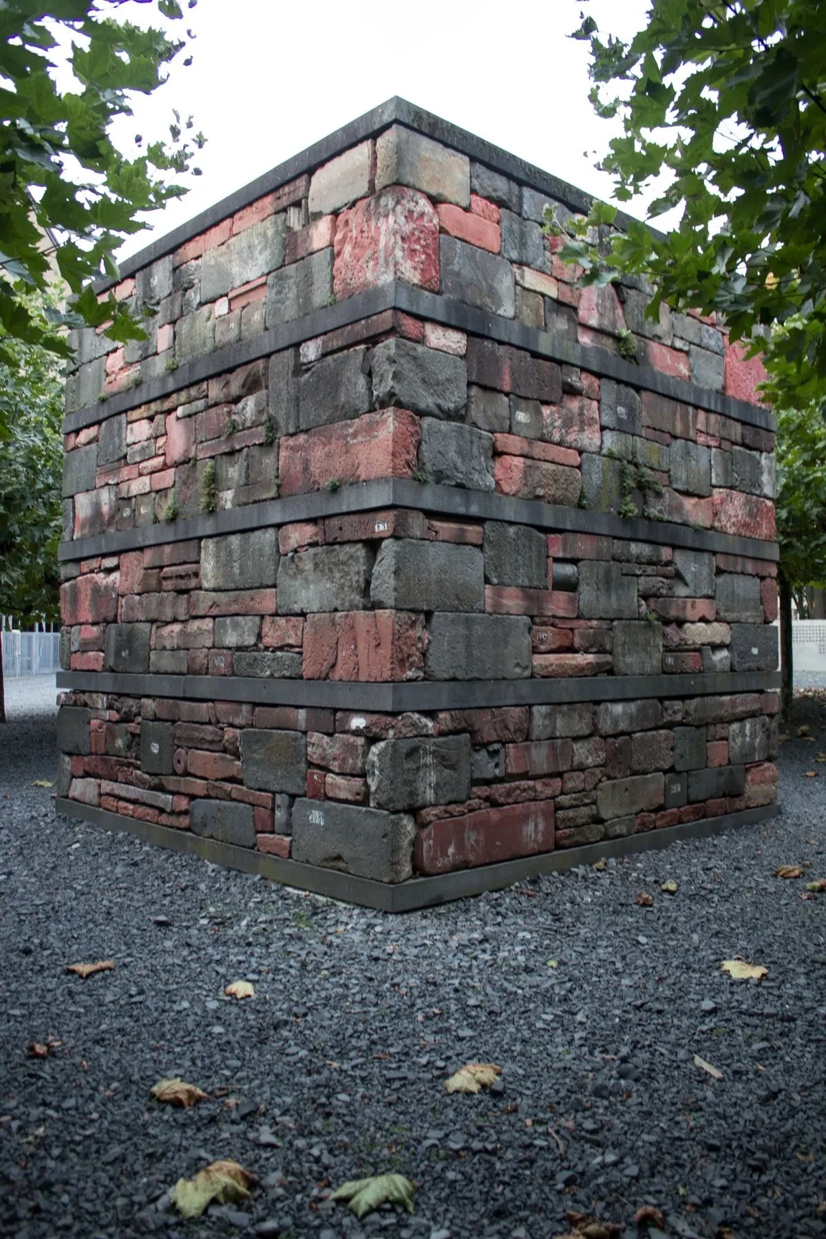 The site consists of several components. At its center stands a stone cube, 5 meters by 5 meters (about 16 feet by 16 feet), built from remnants of buildings in the Judengasse, the old Jewish Ghetto. A steel band outlines part of the footprint of the Börneplatz Synagogue, which was destroyed on Kristallnacht (November 9, 1938). A plaque on the wall describes this destruction in German and English.